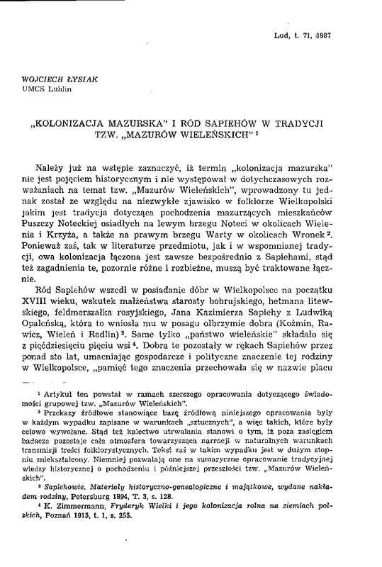 "Kolonizacja mazurska" i ród Sapiehów w tradycji tzw."Mazurów Wieleńskich" / LUD 1987 t.71