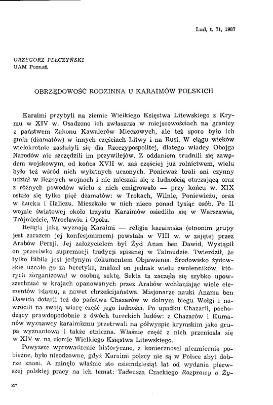 Obrzędowość rodzinna u Karaimów polskich / LUD 1987 t.71