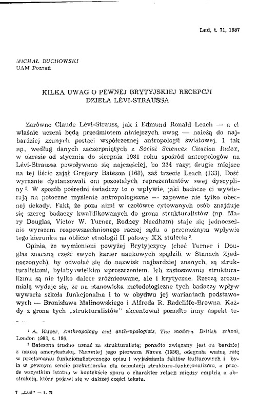 Kilka uwag o pewnej brytyjskiej recepcji dzieła Lévi-Straussa / LUD 1987 t.71