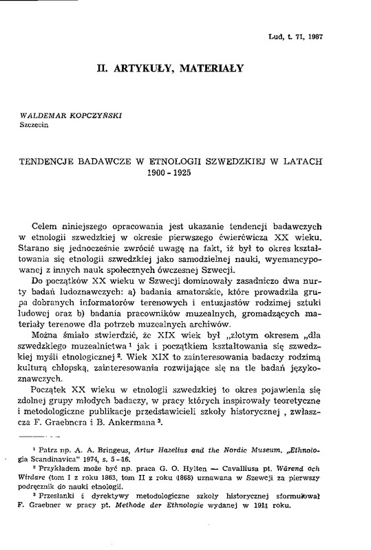 Tendencje badawcze w etnologii szwedzkiej w latach 1900-1925 / LUD 1987 t.71
