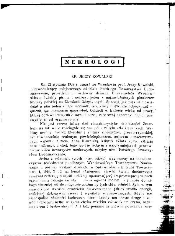 D n . 22 s t y c z n i a 1948 r . z m a r ł we W r o c ł a w i u prof. J e r z y K o w a l s k i ,