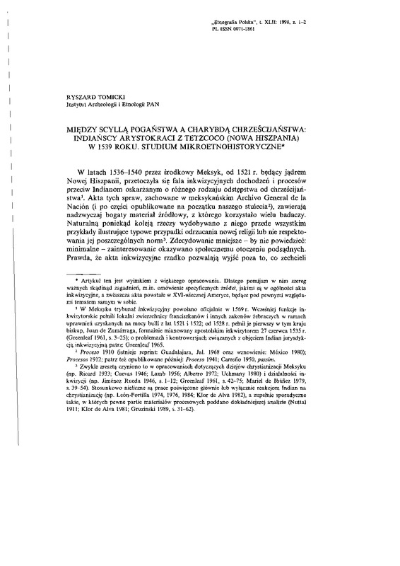 Między Scyllą pogaństwa a Charybdą chrześcijaństwa: Indiańscy arystokraci z Tetzcoco (Nowa Hiszpania) w 1539 roku. Studium mikroetnohistoryczne / ETNOGRAFIA POLSKA 1998 t.42