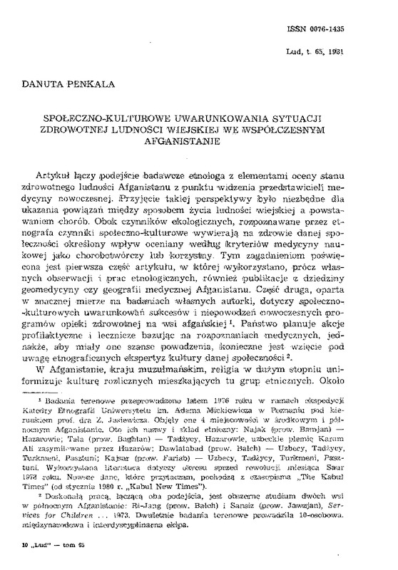 Społeczno-kulturowe uwarunkowania sytuacji zdrowotnej ludności wiejskiej we współczesnym Afganistanie / LUD 1981 t.65