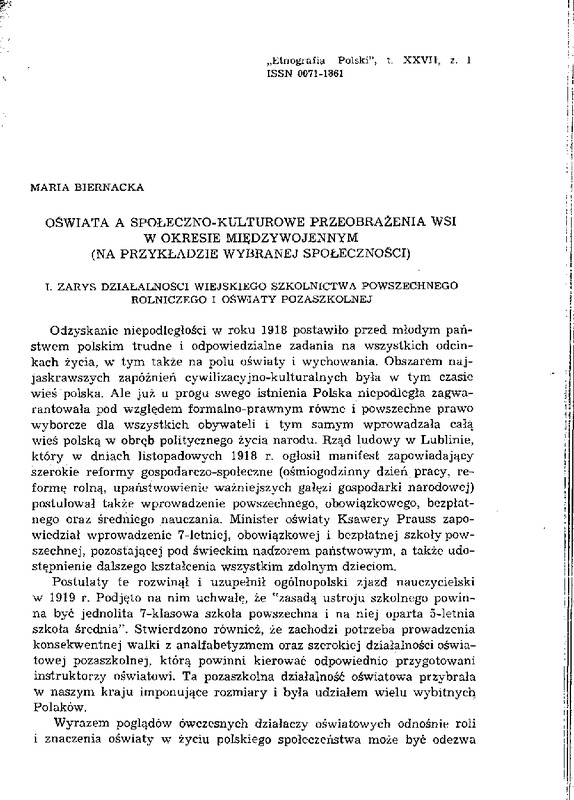 Oswiata a społeczno-kulturowe przeobrażenia wsi w okresie międzywojennym (na przykładzie wybranej społeczności) / ETNOGRAFIA POLSKA 1983 t.27 z.1