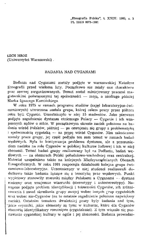 Badania nad Cyganami / ETNOGRAFIA POLSKA 1985 t.29 z.1