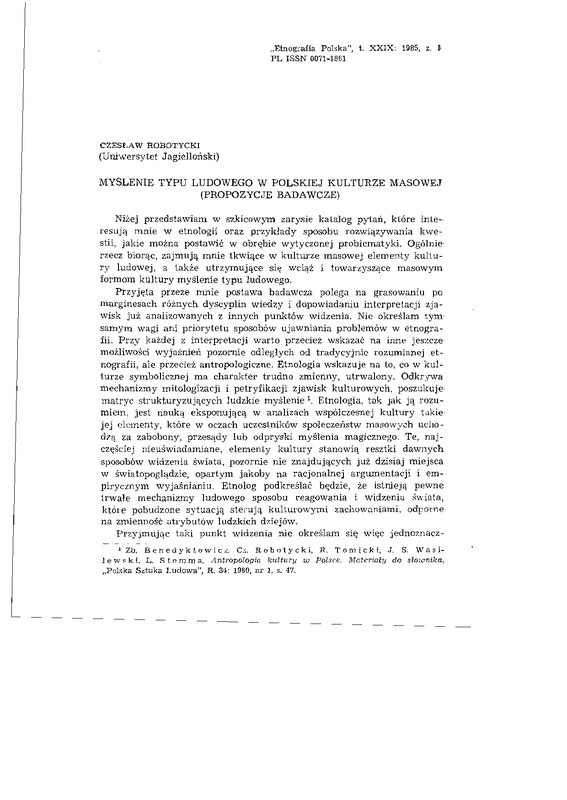 Myślenie typu ludowego w polskiej kulturze masowej (propozycje badawcze) / ETNOGRAFIA POLSKA 1985 t.29 z.1