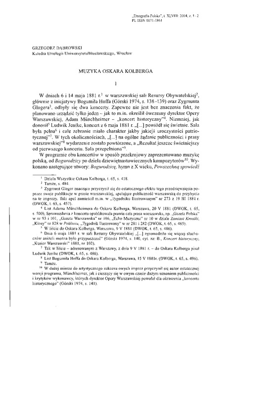 L i s t B o g u m i ł a Hoffa do Oskara Kolberga, Warszawa, 15 V 1881 r. ( D W O K , t. 65, s. 496).