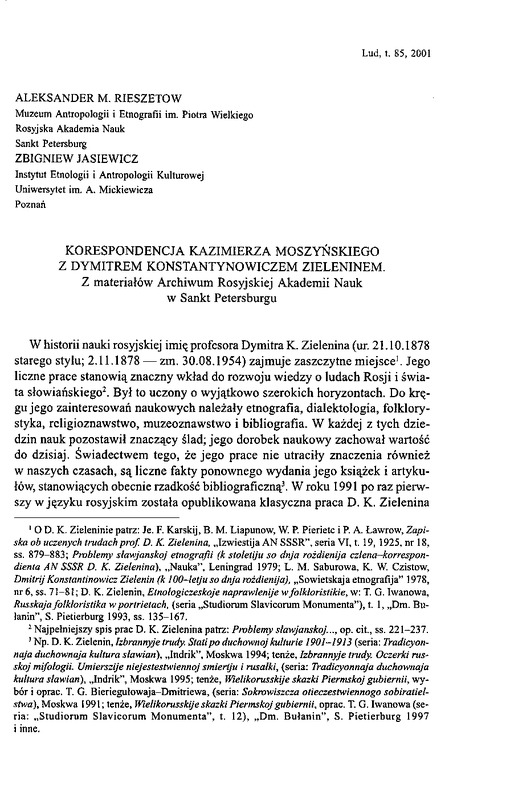 Korespondencja Kazimierza Moszyńskiego z Dymitrem Konstantynowiczem Zieleninem / LUD 2001 t.85