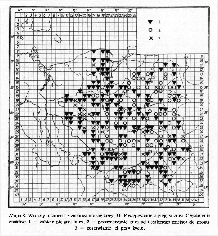 Mapa 8. Wróżby o śmierci z zachowania się kury, I I . Postępowanie z piejącą kurą. Objaśnienia