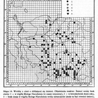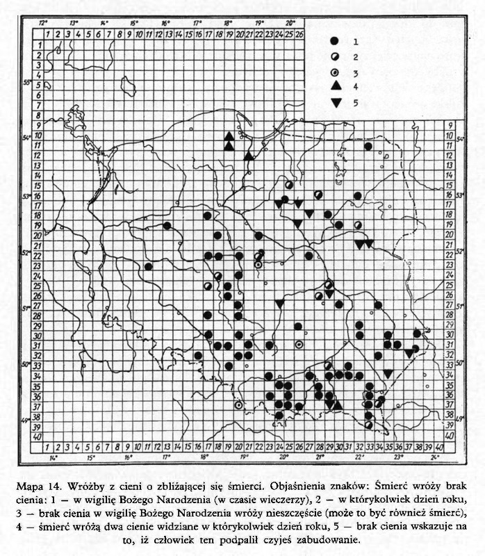 Mapa 14. Wróżby z cieni o zbliżającej się śmierci. Objaśnienia znaków: Śmierć wróży brak