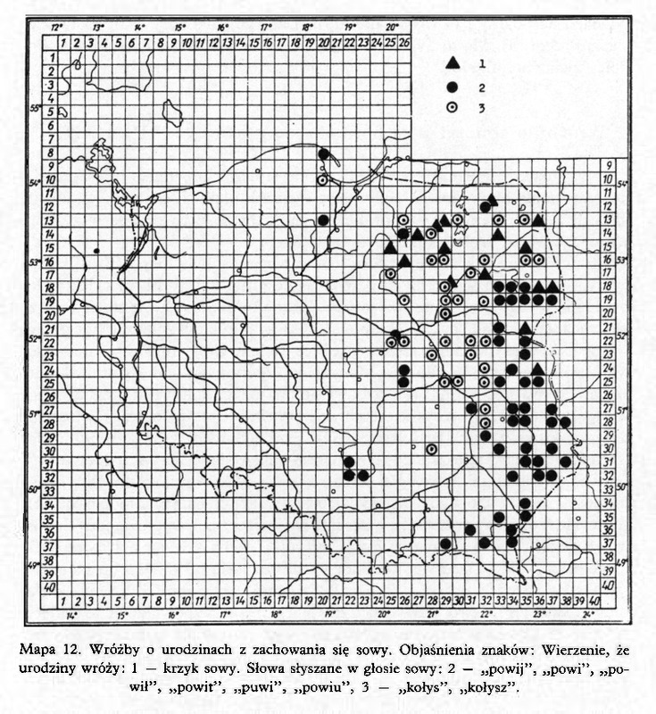 Mapa 12. Wróżby o urodzinach z zachowania się sowy. Objaśnienia znaków: Wierzenie, że
