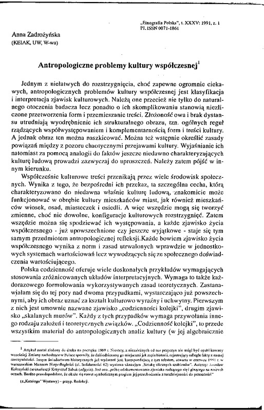 Antropologiczne problemy kultury współczesnej / ETNOGRAFIA POLSKA 1991 t.35 z.1