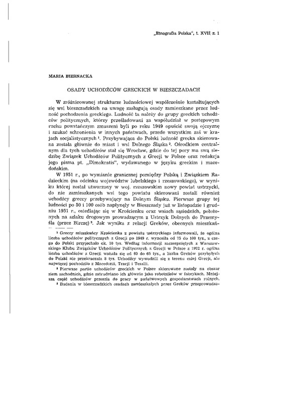 Osady uchodźców greckich w Bieszczadach / ETNOGRAFIA POLSKA 1973 t.17 z.1