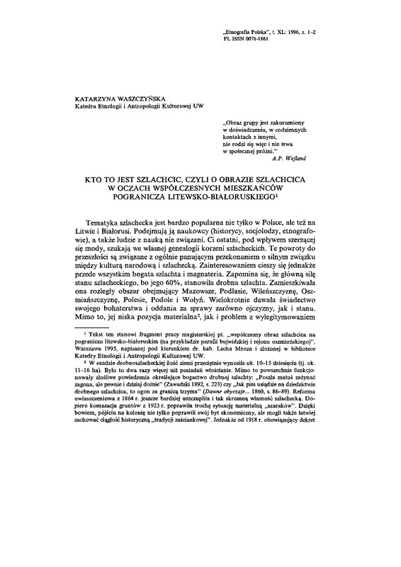 Kto to jest szlachcic, czyli o obrazie szlachcica w oczach współczesnych mieszkańców pogranicza litewsko-białoruskiego / ETNOGRAFIA POLSKA 1996 t.40
