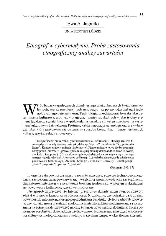 Ewa A. Jagiełło - Etnograf w cybermedynie. Próba zastosowania etnograficznej analizy zawartości