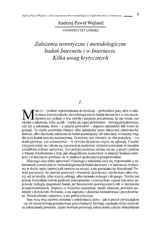 Andrzej Paweł Wejland - Założenia teoretyczne i metodologiczne badań Internetu i w Internecie...
