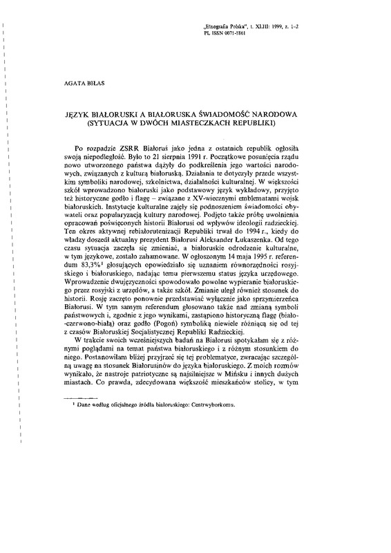 Język białoruski a białoruska świadomość narodowa (sytuacja w dwóch miasteczkach Republiki) / ETNOGRAFIA POLSKA 1999 t.43