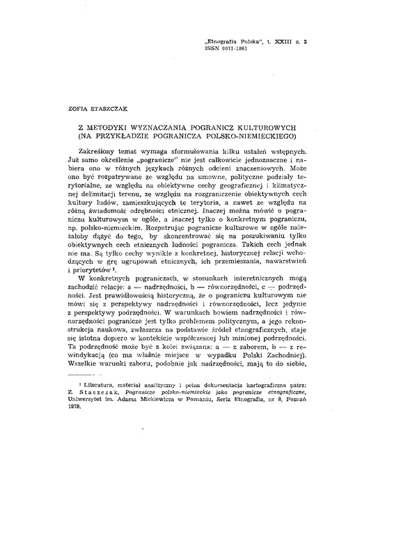Z metodyki wyznaczania pogranicz kulturowych (na przykładzie pogranicza polsko-niemieckiego) / ETNOGRAFIA POLSKA 1979 t.23 z.2
