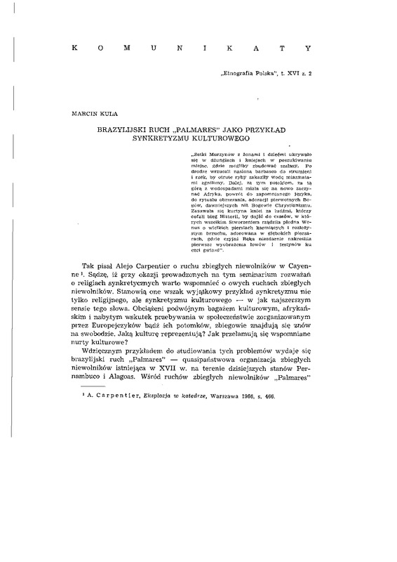 Brazylijski ruch "Palmares" jako przykład synkretyzmu kulturowego / ETNOGRAFIA POLSKA 1972 t.16 z.2