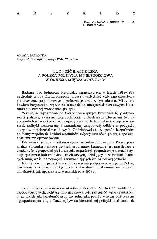 Ludność białoruska a polska polityka mniejszościowa w okresie międzywojennym / ETNOGRAFIA POLSKA 1995 t.39