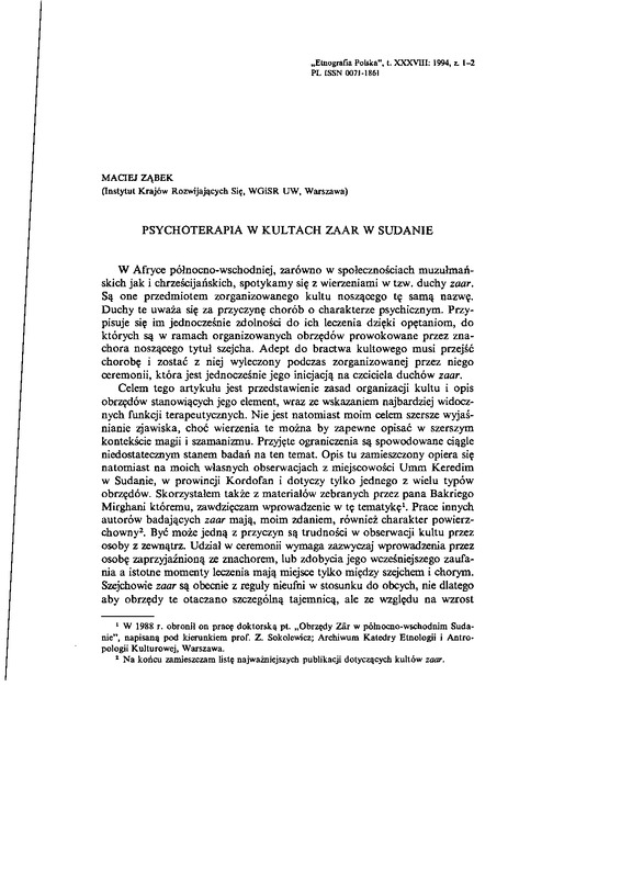 Psychoterapia w kultach zaar w Sudanie / ETNOGRAFIA POLSKA 1994 t.38