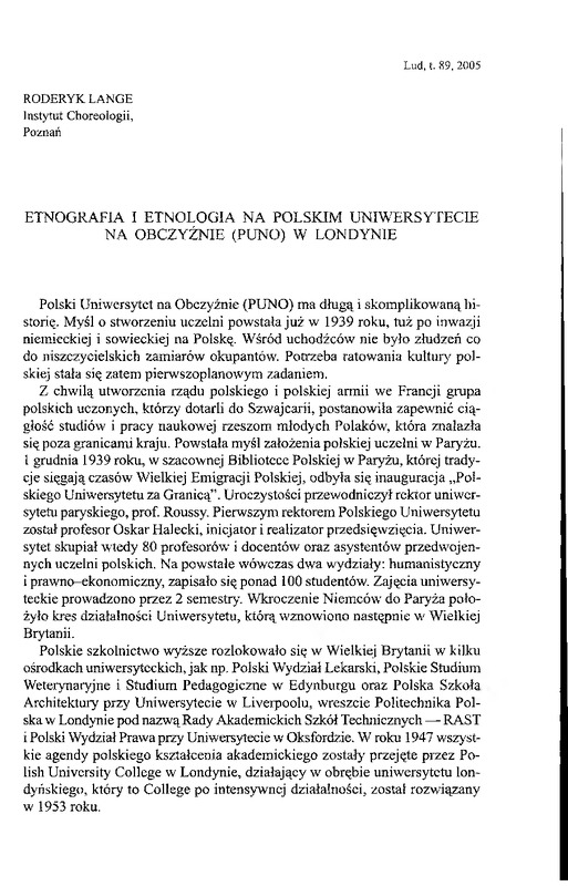 Etnografia i etnologia na Polskim Uniwersytecie na obczyźnie (PUNO)w Londynie / LUD 2005 t.89