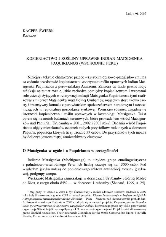 Kopieniactwo i rośliny uprawne IndianMatsigenka Paquirianos ( wschodnie Peru) / LUD 2007 t.91