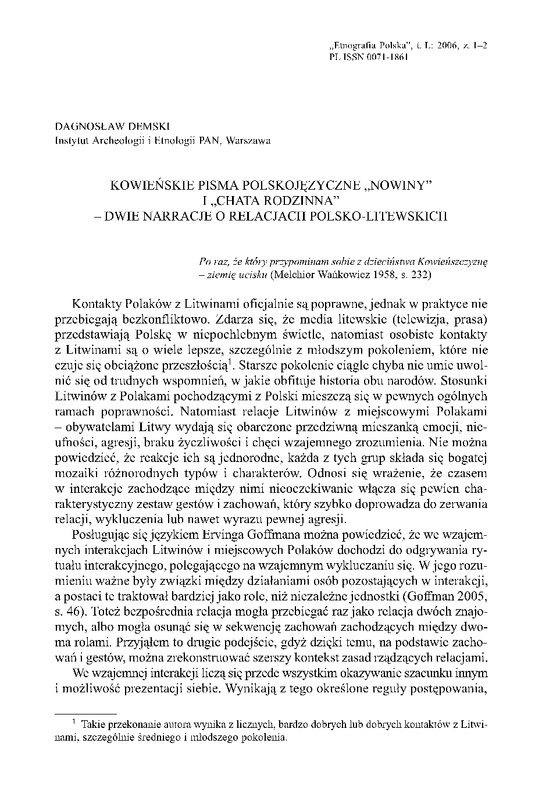 Kowieńskie pisma polskojęzyczne "Nowiny" i "Chata rodzinna" - dwie narracje o relacjach polsko-litewskich / ETNOGRAFIA POLSKA 2006 t.50
