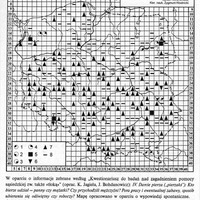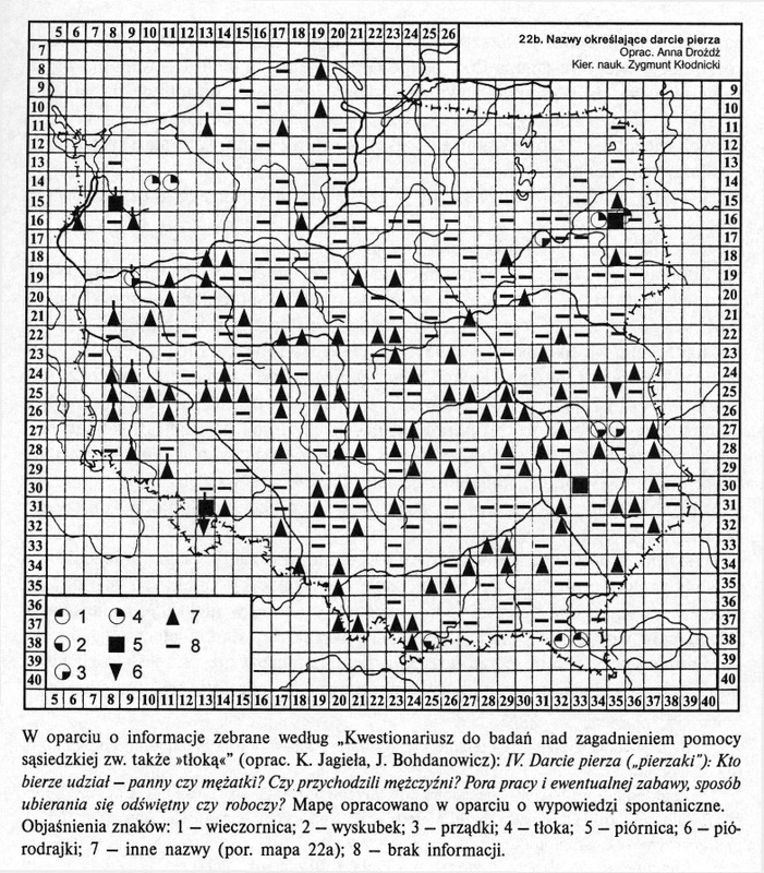 Objaśnienia znaków: 1—wieczornica; 2—wyskubek; 3—prządki; 4—tłoka; 5—piórnica; 6—piórodrajki; 7 — inne nazwy (por. mapa 22a); 8 - brak informacji.