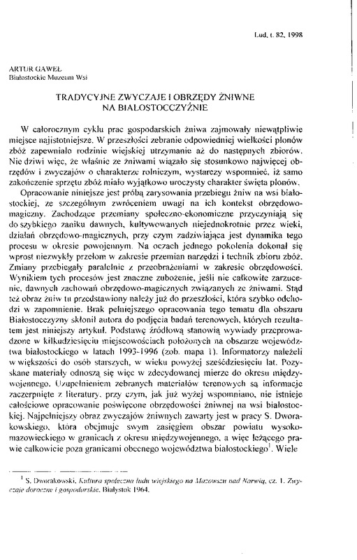 całościowe opracowanie poświęcone obrzędowości żniwnej na wsi białostockiej. Najpełniejszy obraz zwyczajów żniwnych zawarty jest w pracy S. Dworakowskiego, która obejmuje swym zasięgiem obszar powiatu wysokomazowieckiego w granicach z okresu międzywojennego, a więc leżącego prawie całkowicie poza granicami obecnego województwa białostockiego!. Wiele