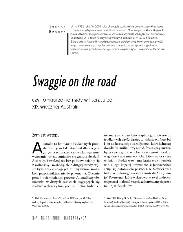 Swaggie on the road, czyli o figurze noamdy w literaturze XIX-wiecznej Australii/ Barbarzyńca 2009 nr 3-4 (16-17)