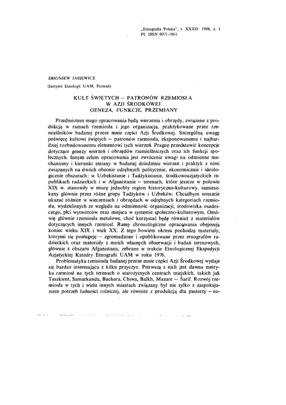Kult świętych - patronów rzemiosła w Azji Środkowej. Geneza, funkcje, przemiany / ETNOGRAFIA POLSKA 1988 t.32 z.1