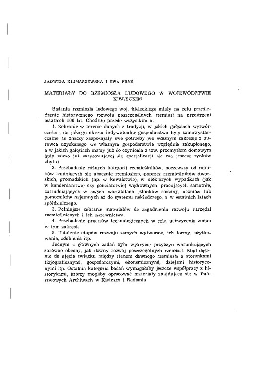 The survey started in 1953 by the Seminar of Slavonic Ethnography of the J a giellonian University in Cracow aimed at tracing the development of various handicrafts during the last hundred years in the Kielce area and at showing factors conditioning their progress. Hence particular stress was laid on the connection with