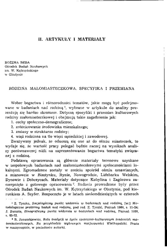 funkcji rodziny, wypływa także z faktu, że badania nad rodziną małomiasteczkową miały zmieścić się w kontekście innych problemów, niemniej ważkich dla w ogóle badań nad małomiasteczkowymi społecznościami lokalnymi. Ponadto zróżnicowanie czasowe oraz niejednorodność