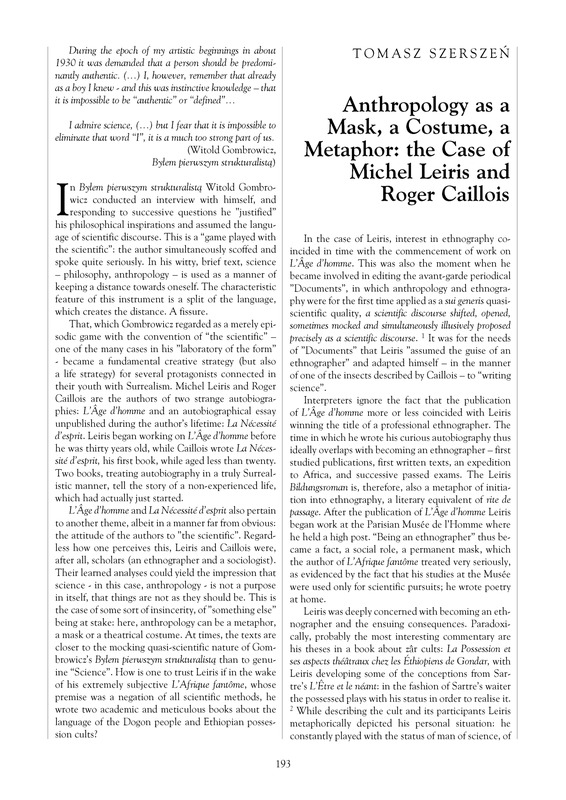 Anthropology as the a Mask, a Costume, a Metaphor:the case of Michel Leiris and Roger Caillois/ Polska Sztuka Ludowa - Konteksty 2014 Special Issue