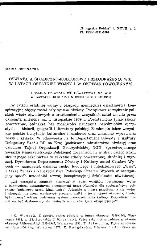 Oświata a społeczno-kulturowe przeobrażenie wsi w latach ostatniej wojny i w okresie powojennym / ETNOGRAFIA POLSKA 1983 t.27 z.2