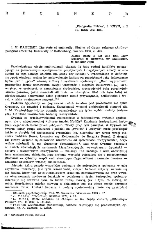 I. M. K A M I Ń S K I . The state of ambiguity. Studies of Gypsy refugees (Anthro