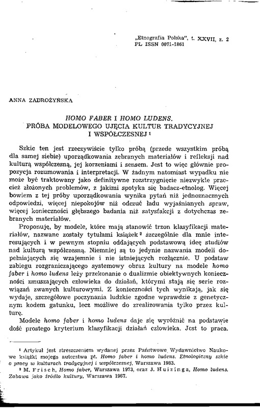 Homo faber i homo ludens. Próba modelowego ujęcia kultur tradycyjnej i współczesnej / ETNOGRAFIA POLSKA 1983 t.27 z.2