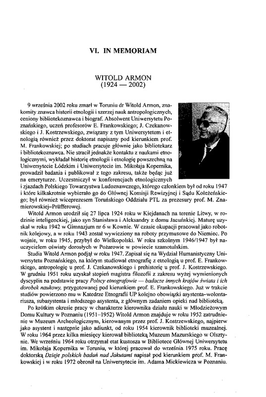 9 września 2002 roku zmarł w Toruniu dr Witold Armon, znakomity znawca historii etnologii i szerzej nauk antropologicznych,