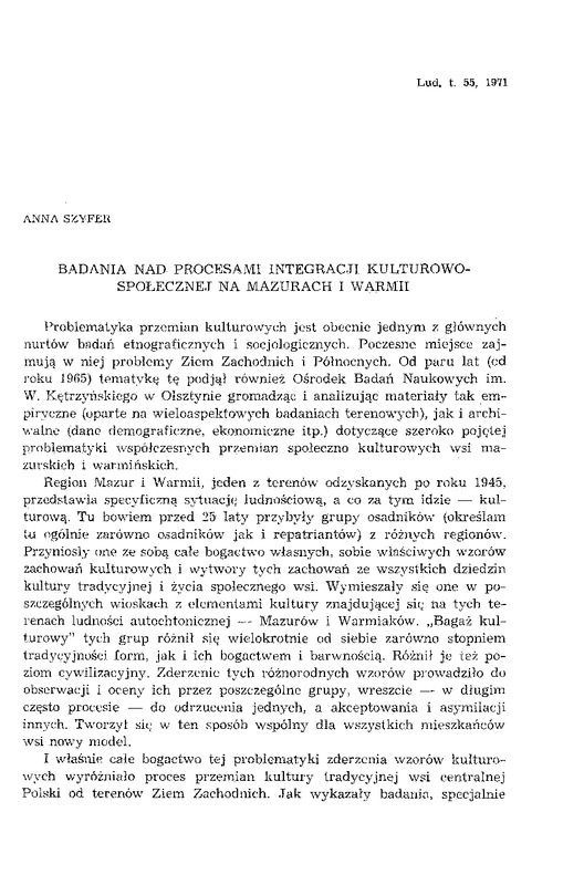 Badania nad procesami integracji kulturowo-społecznej na Mazurach i Warmii / LUD 1971 t. 55