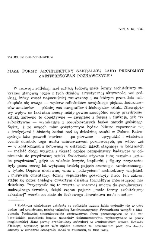 Małe formy architektury sakralnej jako przedmiot zainteresowań poznawczych / LUD 1983 t.67