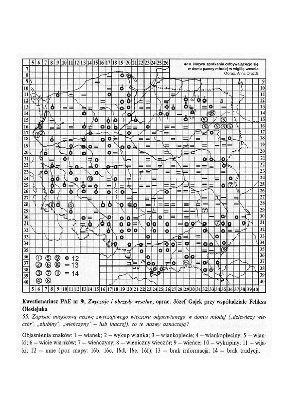 ki; 6 — wicie wianków; 7 — wieńczyny; 8 — wieniczny wieczór; 9 — wieńce; 10 — wykupiny; 11 — wijaki; 12 — inne (por. mapy: 16b, 16c, l6d, 16e, 16f); 13 — brak informacji; 14 — brak tradycji.