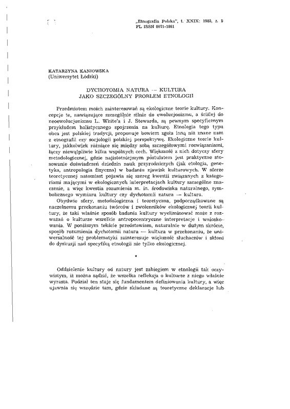 Dychotomia natura - kultura jako szczególny problem etnologii / ETNOGRAFIA POLSKA 1985 t.29 z.1