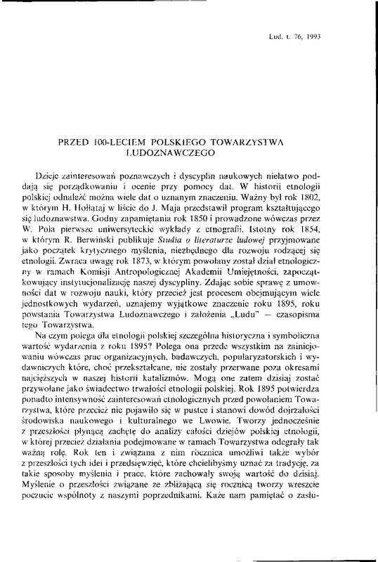 Przed 100-leciem Polskiego Towarzystwa Ludoznawczego / LUD 1993 t.76