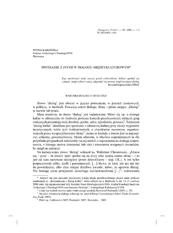 Spotkanie z innym w dialogu międzykulturowym / ETNOGRAFIA POLSKA 2008 t.52