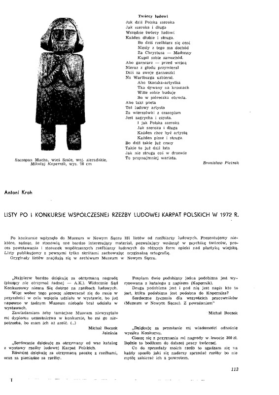 Listy po I konkursie współczesnej rzeźby ludowej Karpat Polskich w 1972 r. / Polska Sztuka Ludowa - Konteksty 1979 t.33 z.2