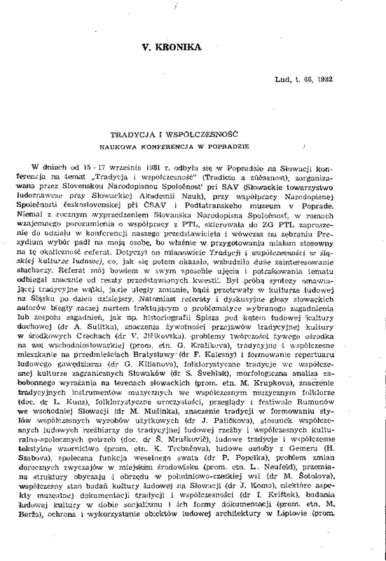 W dinia'ch .od 15 - 1'7 w,rzesma 198.1r. odbyła 'się 'W Popl'adz.i'e na Slo.wacgi konfe!encja IlIa ,temait "Tradycja i współczesność" (T!radj.aia a suaasno's't), :z;organizawana przez Slovelllskou Narodopisnou Spolocnost' pri SAV (Słowackie towarz)"S1Jwo