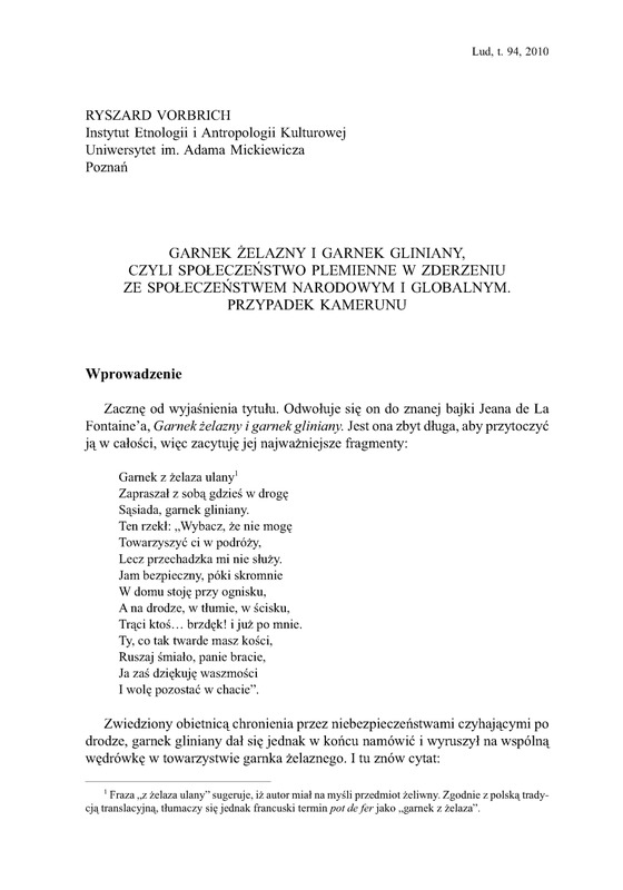Garnek żelazny i garnek gliniany, czyli społeczeństwo plemienne w zderzeniu ze społeczneństwem narodowym i globalnym /LUD 2010 t.94