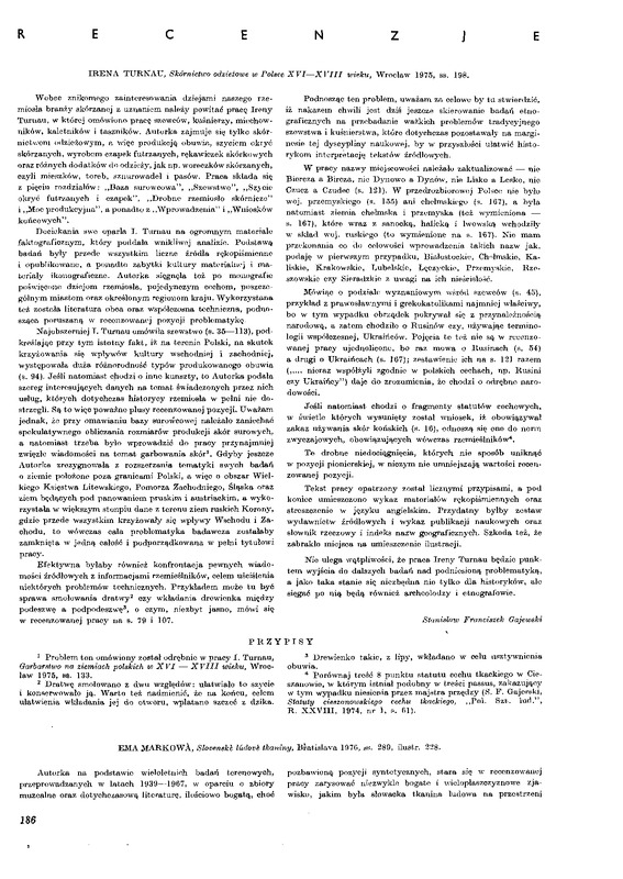Turnau, w której omówiono pracę szewców, kuśnierzy, miechów ników, kaletników i taszników. Autorka zajmuje się tylko skórnictwom odzieżowym, a więc produkcją obuwia, szyciem okryć
