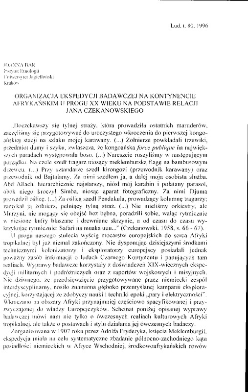Organizacja ekspedycji badawczej na kontynencie afrykańskim u progu XX wieku na podstawie relacji Jana Czekanowskiego / LUD 1996 t.80